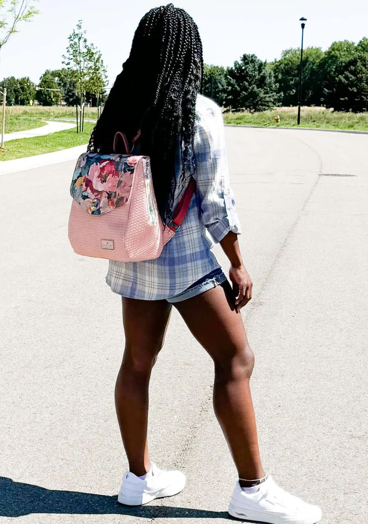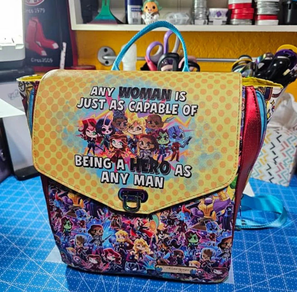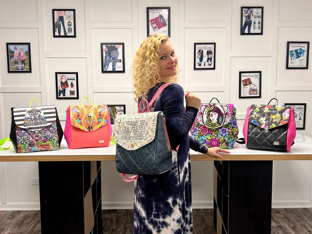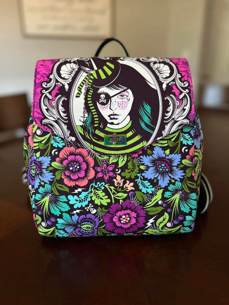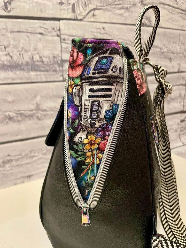 This is an intermediate pattern, in that it uses advanced bag making techniques that require the sewer to have a general familiarity with bag making. It requires accurate cutting/sewing and installing a curved side gusset which can be challenging for new sewers. Specs: approximately 11” wide by 11½” high and 5½” deep. Straps are cut 40” long and fully adjustable with a convenient grab handle along the top. It features 1 exterior vertical zipper pocket along the back for easy access to your cellphone while the bag is being worn, and inside has a slip pocket, zippered pocket, and a bottle sleeve. This bag has a drop in lining.