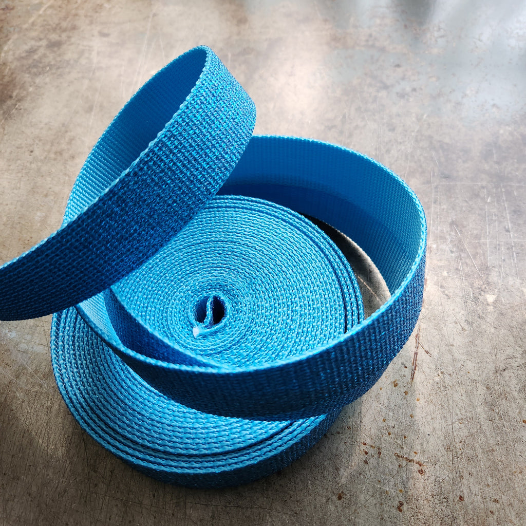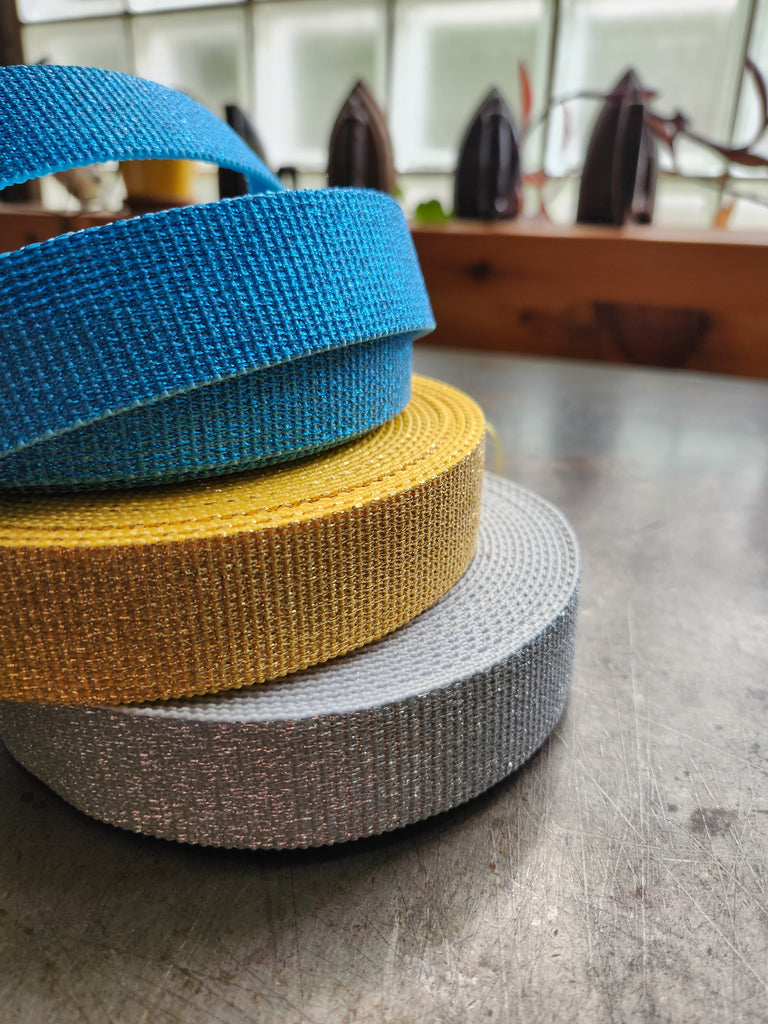 Perfect for bag making, as webbing helps to create straps in a fraction of the time it takes to make fabric straps. Strong and pliable cotton & acrylic material with metallic glitter sparkles throughout. One side is glittery. After cutting your lengths use fray check on the ends to prevent fraying or take a lighter to them for a second or two.